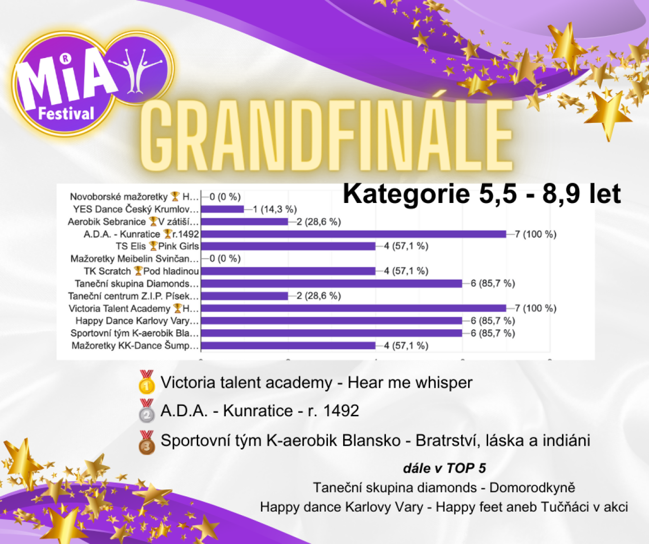 Startovní listinu najdete níže po uzávěrce řádných přihlášek, můžete se tedy podívat, kdy přijdete na řadu, s kým soutěžíte a začít ladit poslední detaily Vašeho vystoupení. Po uzávěrce sledujte stránky.