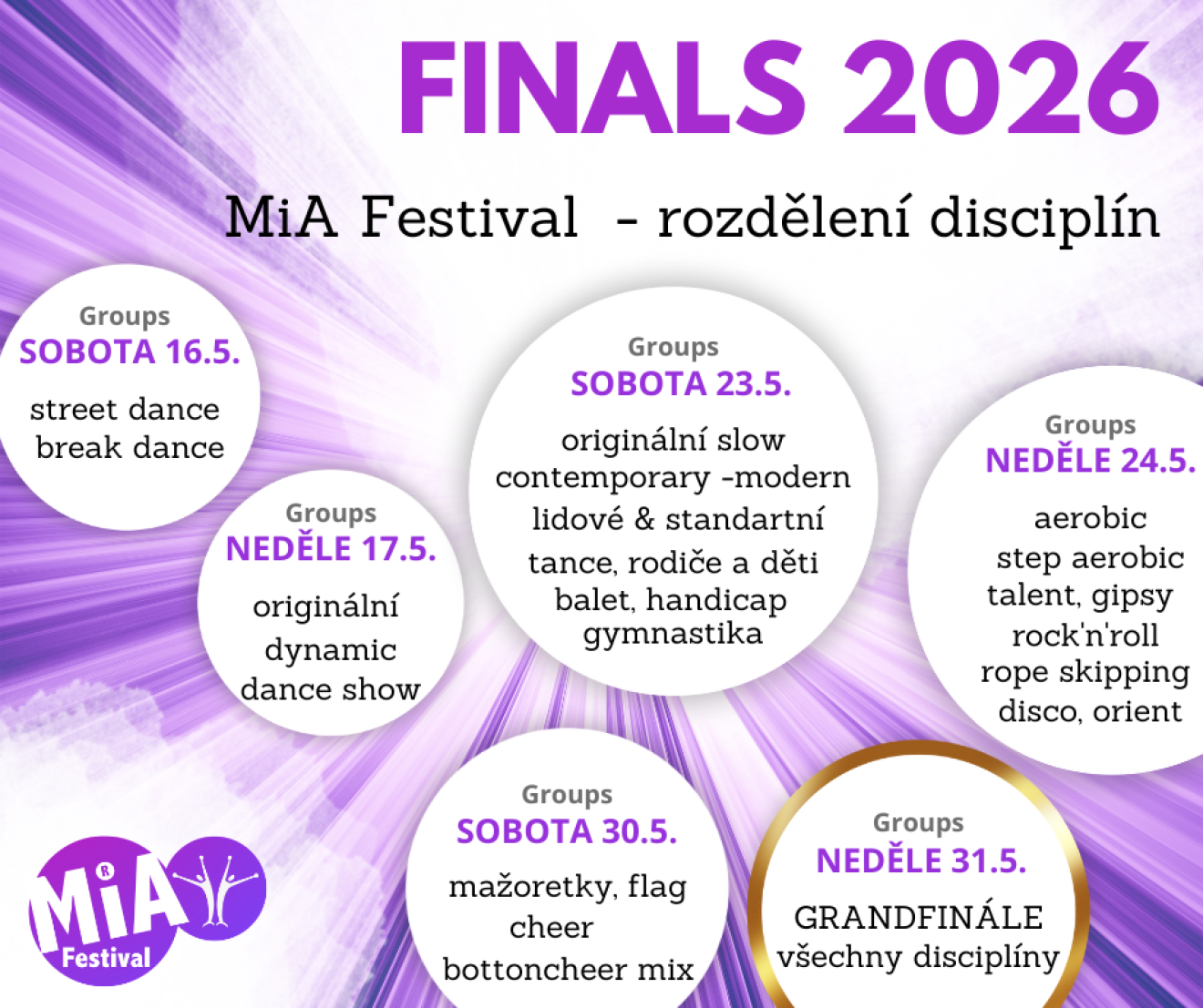 Věděli jste, že MiA Festival je postupová soutěž? Vaše tance, výkruty a výrazy, které se vám obzvlášť podaří, budou chtít rozhodčí vidět i na velkolepé finálové akci.